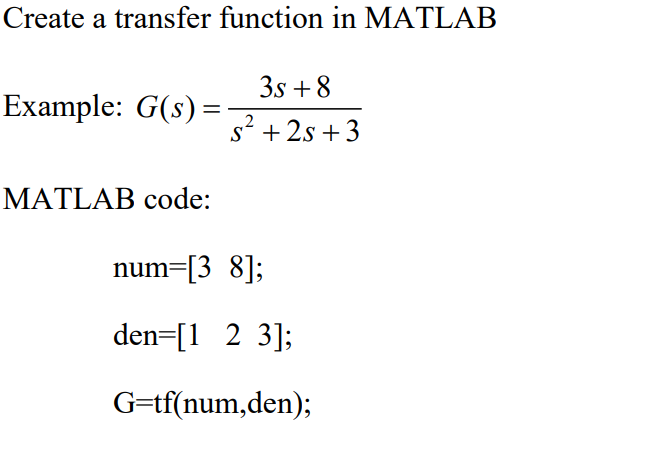 Solved Create A Transfer Function In Matlab 3s 8 Example Chegg Com
